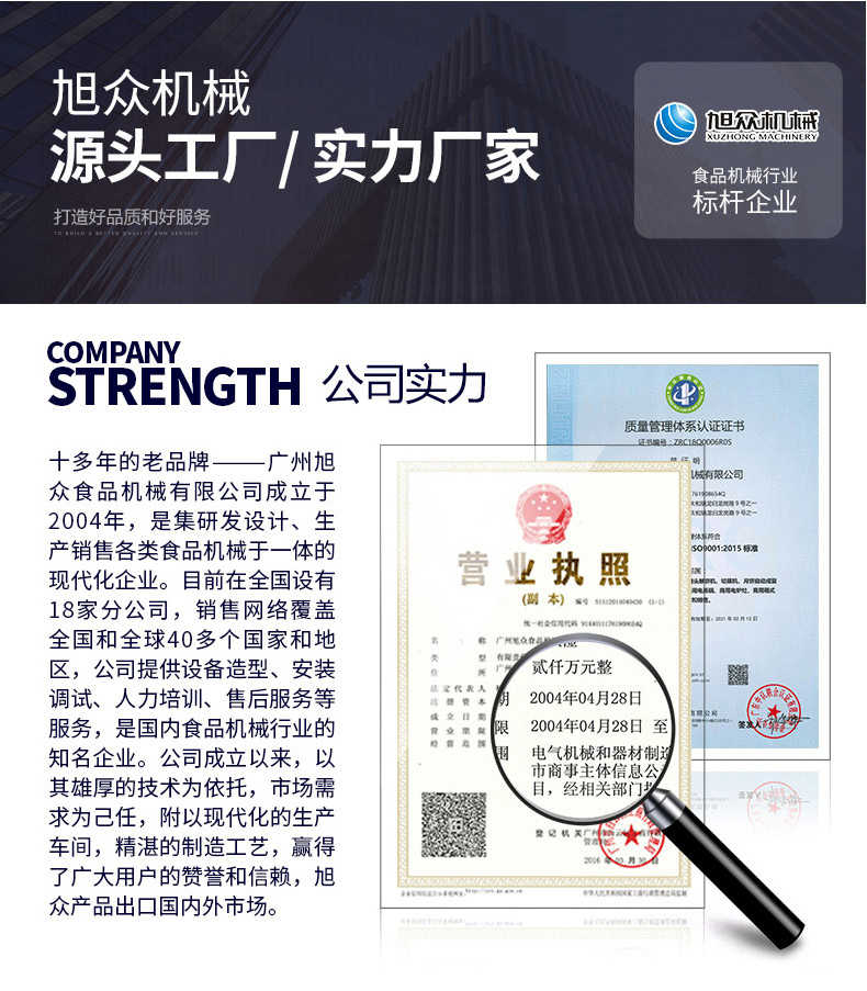 廣州旭眾食品機(jī)械有限公司是一家集科研開發(fā),生產(chǎn)設(shè)計(jì),營銷服務(wù)為一體的現(xiàn)代化生產(chǎn)企業(yè)?,F(xiàn)代化生產(chǎn)車間,精湛制造技術(shù),所產(chǎn)機(jī)械歷經(jīng)市場重重考驗(yàn),不斷贏得海內(nèi)外客戶的贊譽(yù)。
