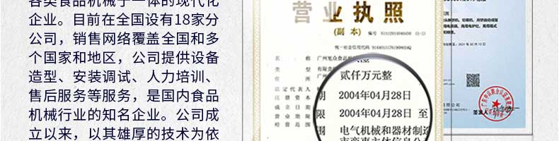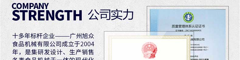 廣州旭眾食品機械有限公司是一家集科研開發(fā),生產(chǎn)設(shè)計,營銷服務(wù)為一體的現(xiàn)代化生產(chǎn)企業(yè)?,F(xiàn)代化生產(chǎn)車間,精湛制造技術(shù),所產(chǎn)機械歷經(jīng)市場重重考驗,不斷贏得海內(nèi)外客戶的贊譽。