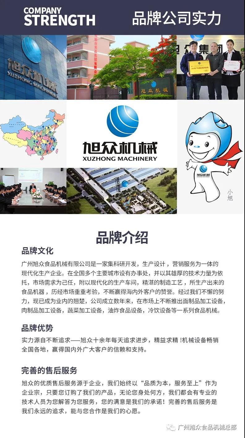 廣州旭眾食品機械有限公司是一家集科研開發(fā),生產(chǎn)設(shè)計,營銷服務(wù)為一體的現(xiàn)代化生產(chǎn)企業(yè)?,F(xiàn)代化生產(chǎn)車間,精湛制造技術(shù),所產(chǎn)機械歷經(jīng)市場重重考驗,不斷贏得海內(nèi)外客戶的贊譽。