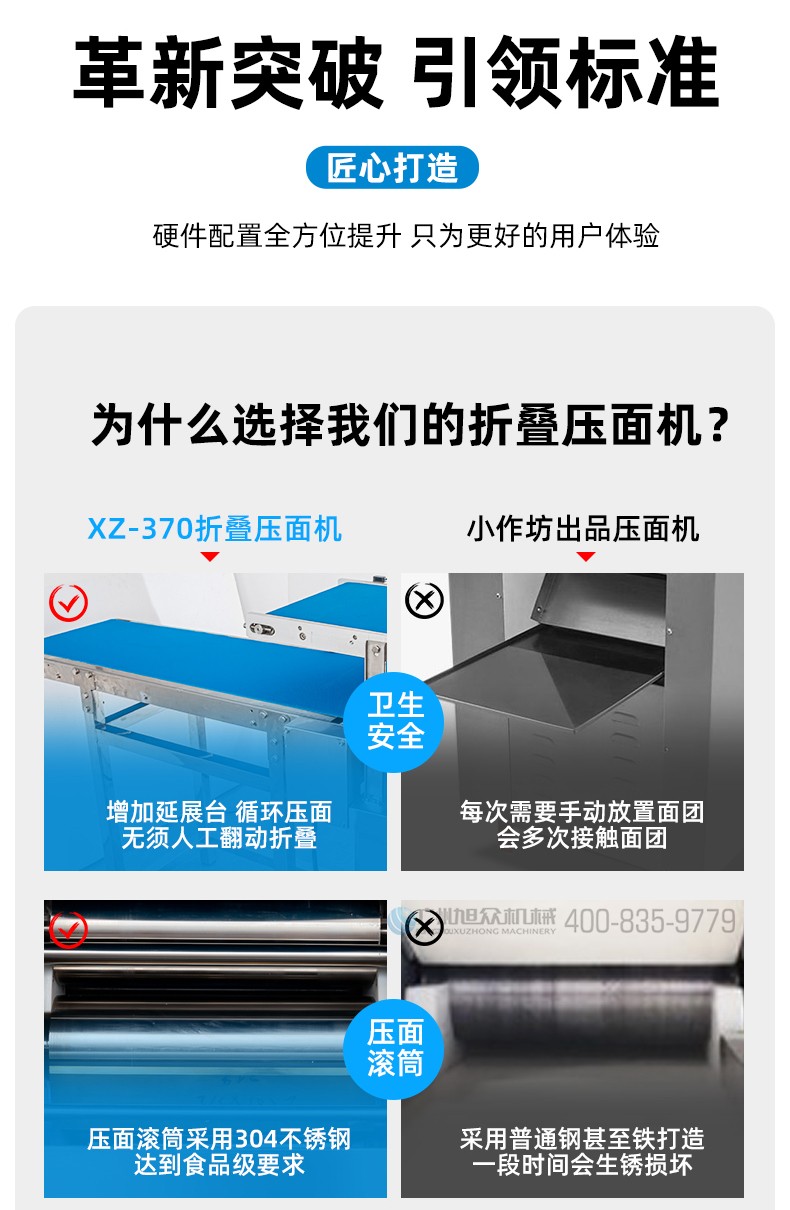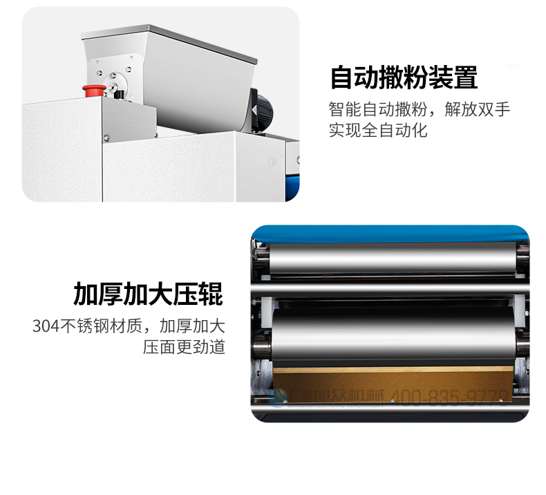 XZ-ZDYMJ370型自動折疊壓面機,整機不銹鋼機身打造,真材實料,選用不銹鋼材質(zhì),打造經(jīng)久耐用、防腐蝕。匠心細節(jié),彰顯品質(zhì)貼心設計。一鍵設定壓面次數(shù),智能定時,只需設定好壓面次數(shù),就能全自動壓面出面。